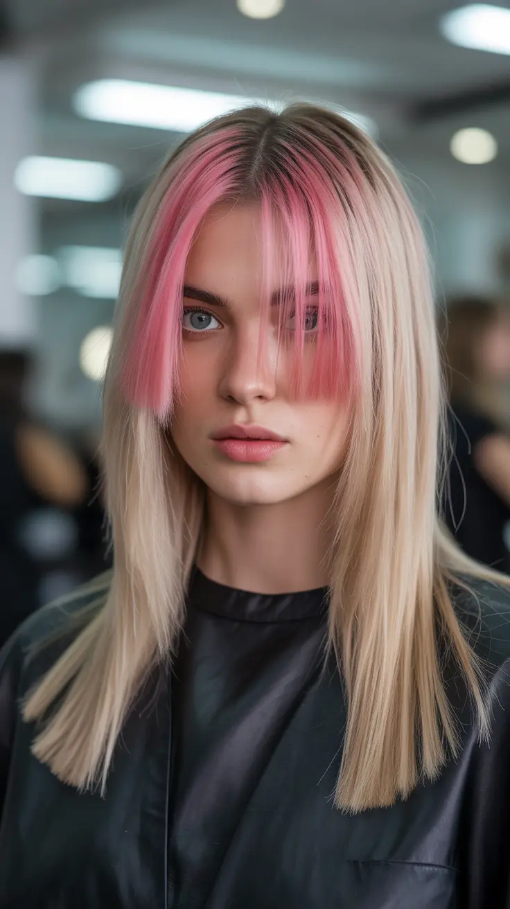 Straight hair with pink and blonde face-framing pieces is a stunning way to mix bold color with soft glam vibes. This look features sleek, shiny strands that cascade down, highlighting the face beautifully. The blend of soft pink and blonde creates a gentle contrast, making it perfect for anyone looking to add a touch of creativity to their hair.