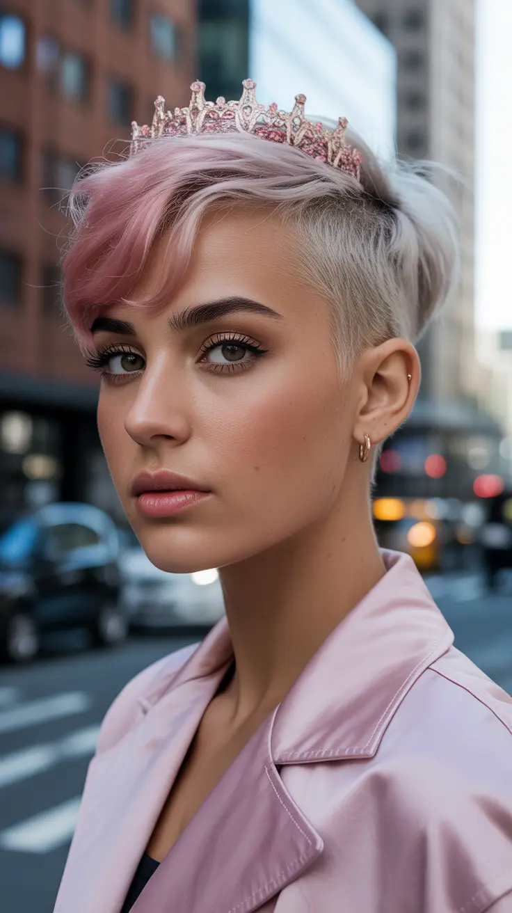 This undercut pixie style is a stunning blend of pink and blonde hair that radiates both boldness and softness. The sharp, edgy cut features a playful crown of pastel hues, creating a striking contrast against the closely cropped sides. This look is perfect for anyone wanting to express their creative hair color choices while keeping it chic and manageable.
