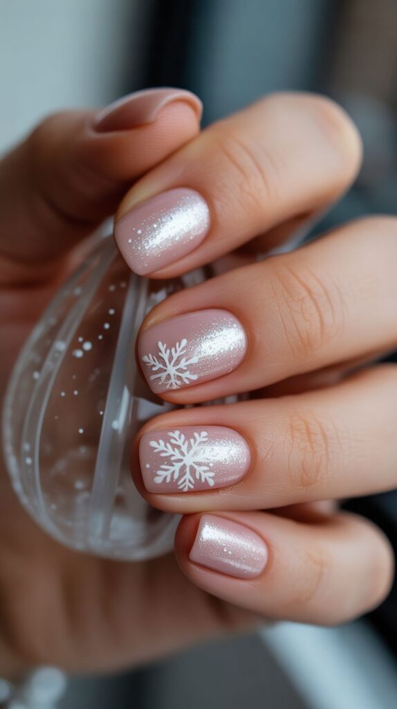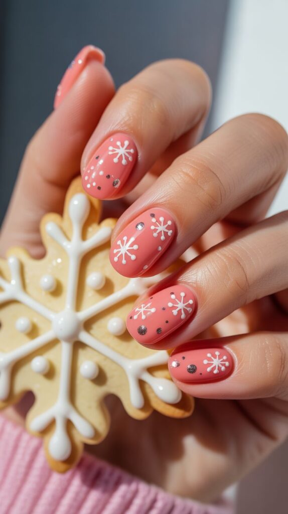 Warm coral tones meet white snowflakes for a cheerful seasonal manicure. Add silver glitter for subtle shine that glows under holiday lights. Perfect for those who love festive nails with a touch of sunshine.