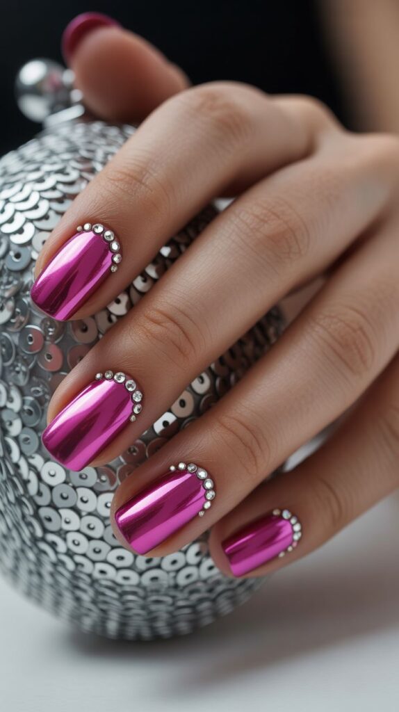 Make a statement with bold magenta chrome nails adorned with rhinestones. The jewel-like shine creates a glamorous, high-fashion finish that’s perfect for festive parties and winter events.