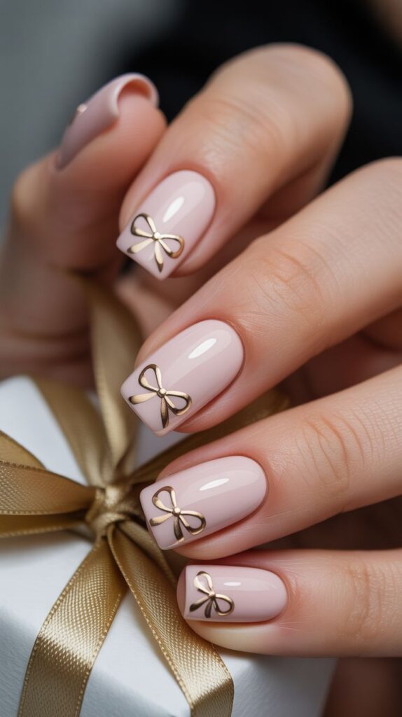 Soft, feminine, and adorable matte blush pink nails topped with tiny gold bows feel like little holiday presents. They’re subtle yet festive, perfect for both casual and dressy occasions.