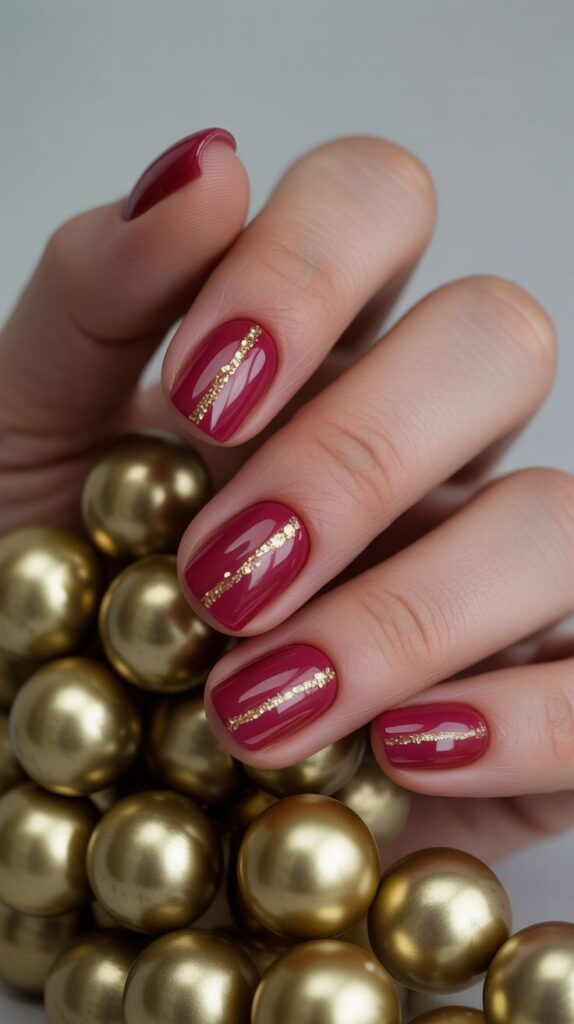 Deep raspberry tones accented with a thin gold stripe deliver instant sophistication. It’s an easy yet impactful design that feels luxurious without going over the top. Perfect for an elegant December nails look.