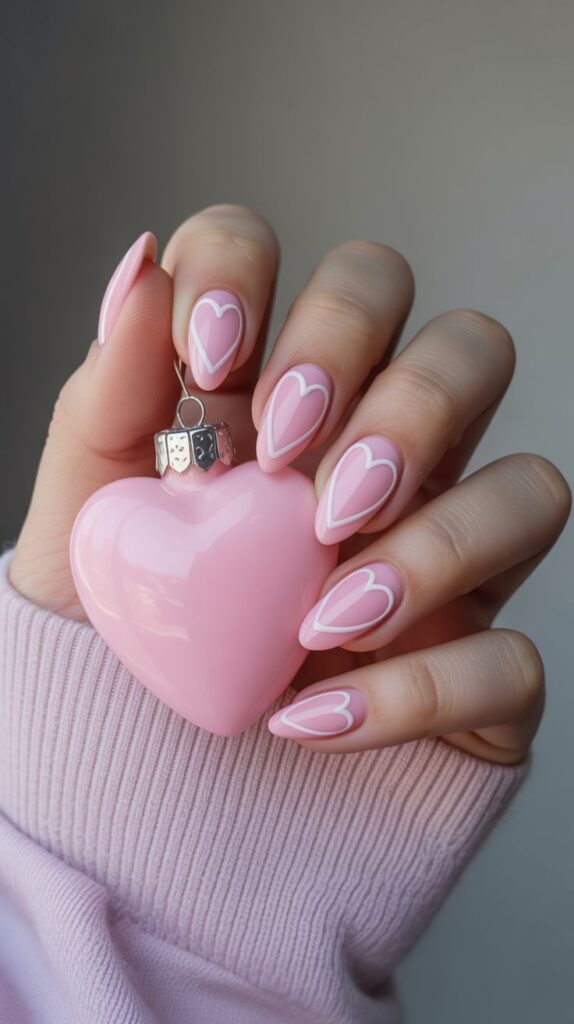 Sweet, flirty, and ultra-cute candy-floss pink nails outlined with white hearts bring romantic energy to winter. This manicure is perfect for cozy date nights, festive parties, or anyone who loves a touch of playful charm.