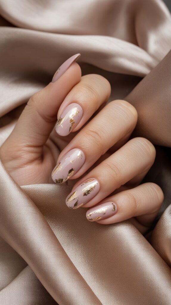 For subtle shimmer lovers, dusty pink with gold foil accents is pure sophistication. The gold flecks glimmer under twinkling lights, adding just enough holiday sparkle. These cute nails balance festive warmth with modern elegance.