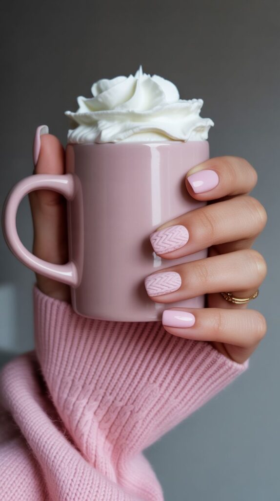 Think cozy cable-knit sweaters but for your fingertips. A matte baby pink base with raised knit details gives this manicure texture and personality. Perfect for snuggling up with cocoa and showing off your soft winter style.