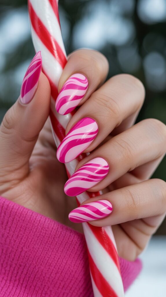 A festive swirl of pink and white that looks good enough to eat. These candy-inspired nails bring playful nostalgia to your holiday look bold, cheerful, and full of personality. They’re the definition of fun December nails.