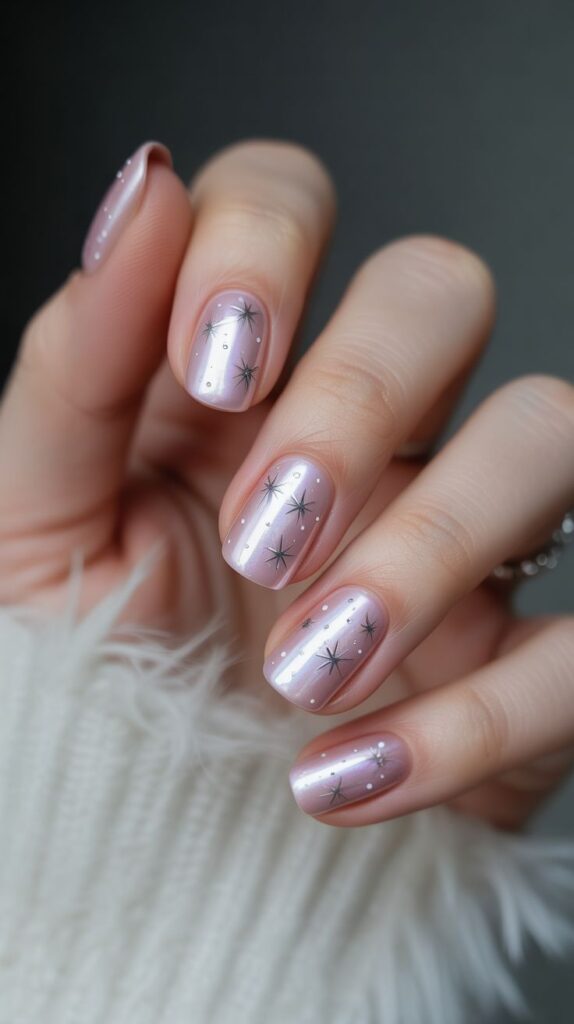 A luminous pearl-pink base sprinkled with tiny silver stars brings soft celestial beauty to your fingertips. The subtle sparkle mirrors winter’s starry skies delicate, graceful, and perfect for any celebration.