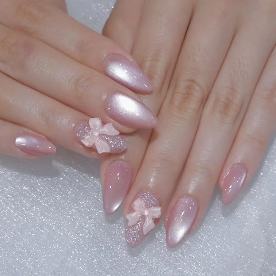These pink chrome nails feature a delicate blush base finished with a smooth pearl-like chrome glow that reflects light beautifully. The almond shape keeps the look elegant, while the 3D bow accents on select nails add a soft, feminine touch without overpowering the design. This style perfectly balances light pink chrome nails with subtle sparkle, making it ideal for romantic looks, special occasions, or anyone who loves polished girls nails with gentle detail.