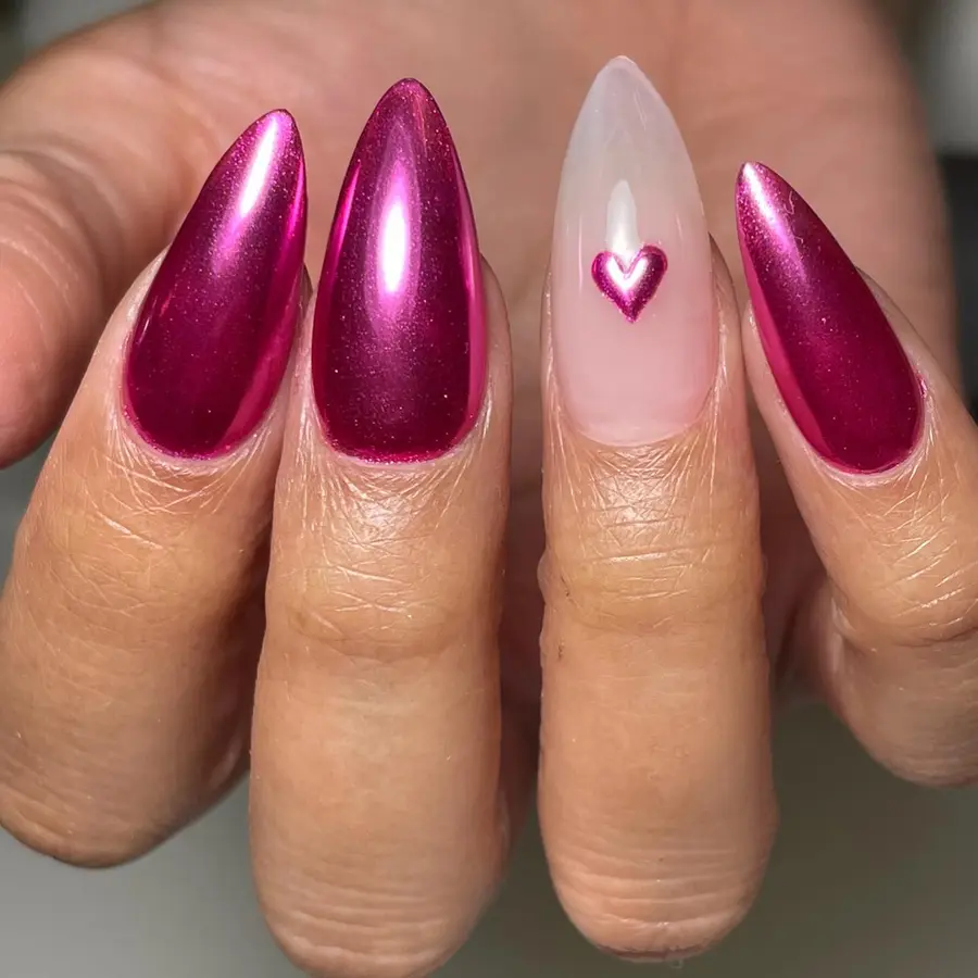 21. Deep Pink Chrome Almond Nails With Minimal Heart Accent