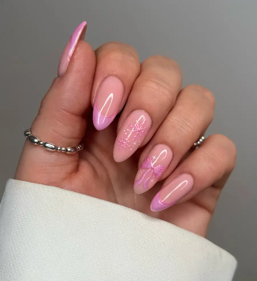 These pink chrome nails showcase a soft blush base layered with a subtle chrome glow that reflects light beautifully. Delicate star and sparkle accents add a dreamy, celestial vibe without overpowering the design. The almond shape keeps the look elegant, while the mix of light pink chrome nails and deeper pink accents creates contrast and depth. It’s a stylish choice for girls nails that feel playful, polished, and perfectly on-trend.