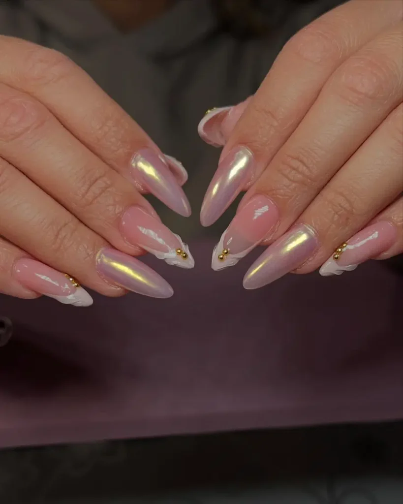 20. Soft Pink Chrome Almond Nails With Pearly Glow and Gold Accents