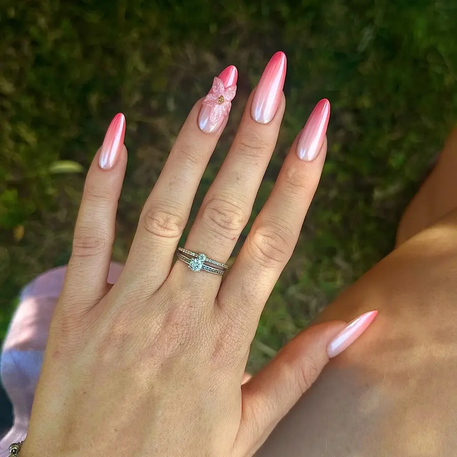 16. Pink Chrome Almond Nails With a Soft Pearly Glow and Floral Accent