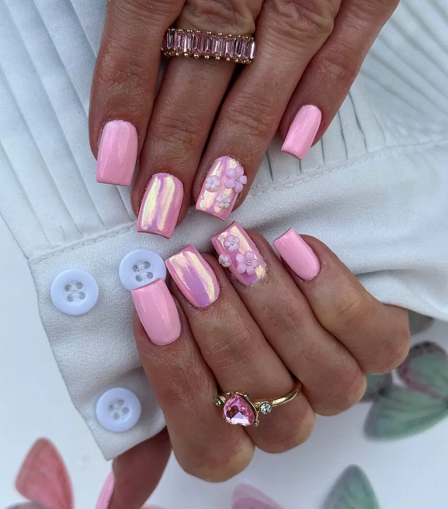 5. Soft Baby Pink Chrome Nails With Floral Accent Details
