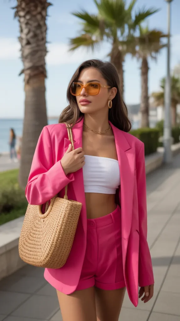 Nothing says confident summer chic like a matching hot pink blazer set. The tailoring makes it polished, while the white tube top keeps the look breezy and fresh. A straw tote adds beachy texture that pairs beautifully with bold pink. Gold hoops and oversized sunnies elevate the whole look into coastal vacation glam. It’s a stylish everyday look for days you want to stand out while keeping the vibe relaxed.