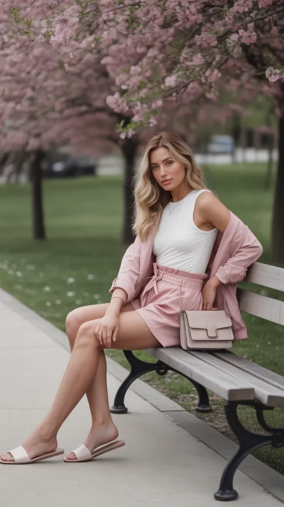 This look is the definition of cute-girly energy all those coordinated pink tones instantly make the outfit feel playful and chic. The tailored shorts keep everything polished, while the white bustier top adds a flirty balance. Throwing on a pink cardigan softens the whole vibe and makes it café-date ready. Matching your mini shoulder bag with your shorts ties the outfit together beautifully. Add pink sneakers for comfort that still looks intentional and stylish for your everyday look.