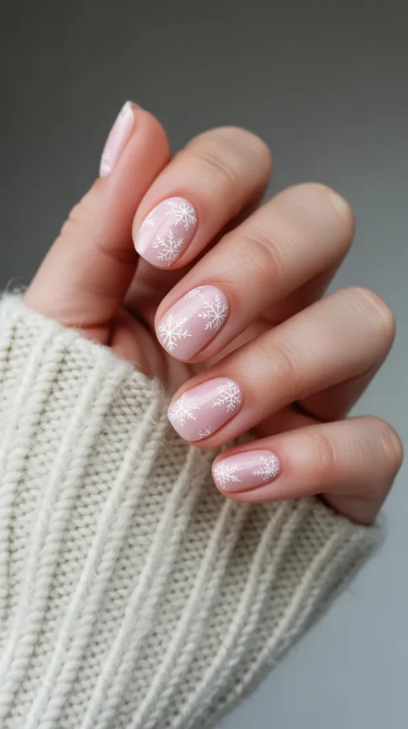 Soft pink nails decorated with white snowflakes instantly give cozy winter magic. The design feels sweet but sophisticated, ideal for anyone who wants cute yet classy nails. It’s perfect for sipping cocoa while watching snow fall. ☕❄️