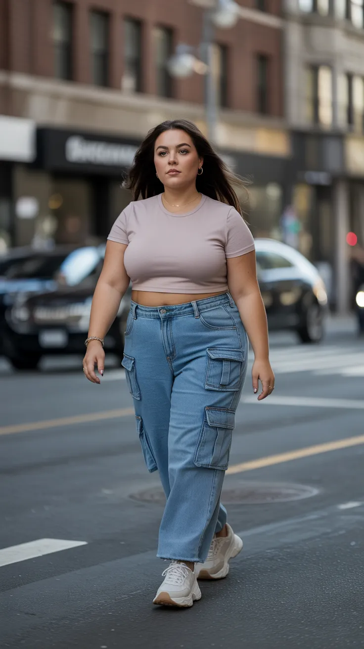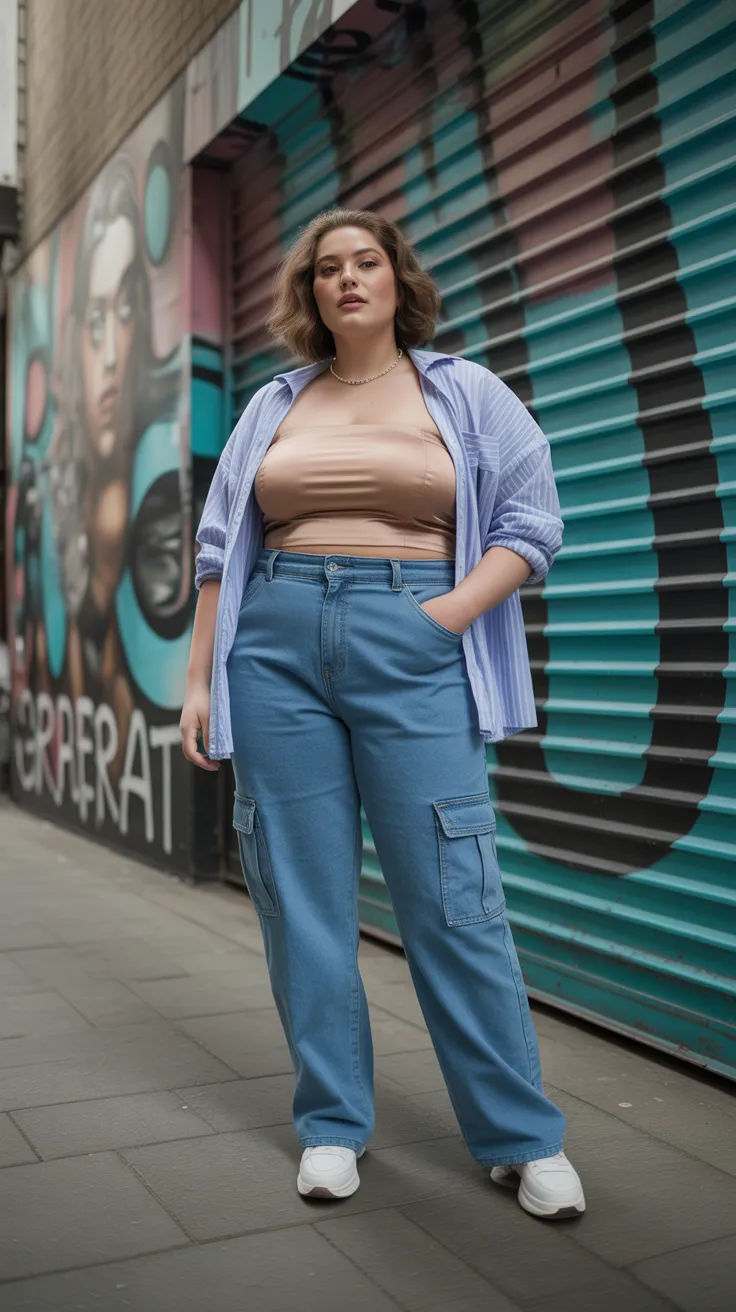 High-waisted cargo jeans paired with a tube top create a fun and trendy look. This outfit is perfect for showcasing your curves while keeping it casual and chic. Add a light layer, like a denim shirt, for those cooler days, and you’ve got a stylish plus size cargo jean outfit that works for any occasion.