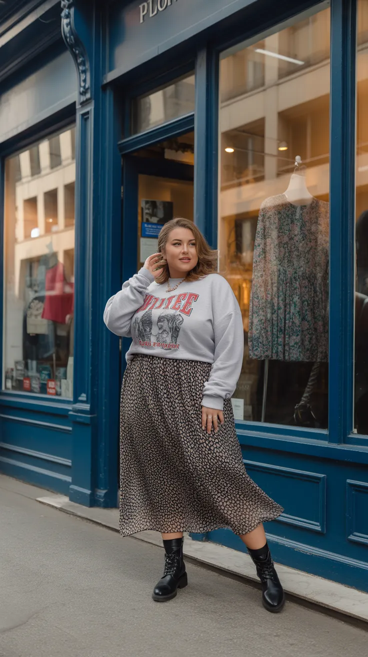 This outfit is a fun mix of comfort and style. The graphic sweatshirt adds a playful touch, while the midi skirt flatters every curve. Pairing it with boots makes it perfect for any casual outing.