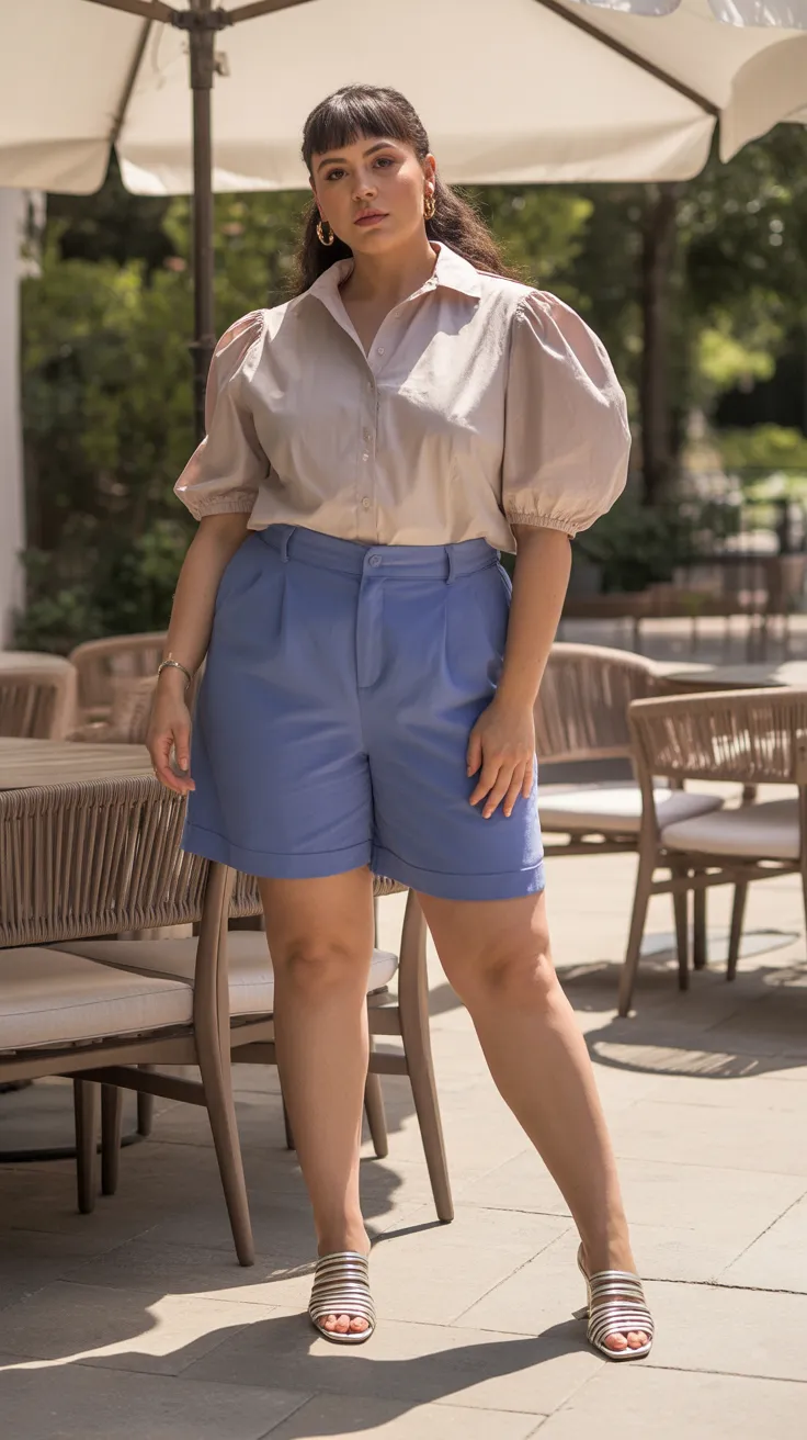This outfit is a fun mix of style and comfort. The puff sleeve blouse adds a playful touch, while the tailored shorts keep things polished. Perfect for cute plus size office outfits or a casual day out, this look celebrates big size fashion beautifully!
