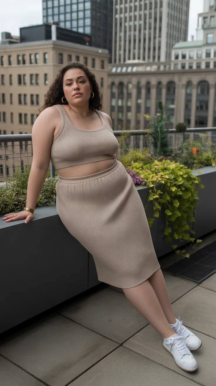 This matching knit set is a perfect choice for those looking to flaunt their curves in style. The cropped top paired with a sleek skirt creates a chic silhouette that works for any occasion. Whether you’re dressing up for a cute plus size office outfit or a casual outing, this look is sure to turn heads!