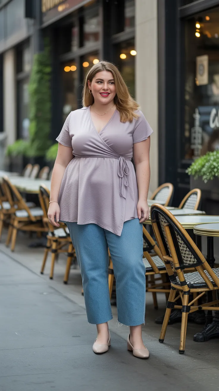 A flowy wrap top paired with straight-leg jeans is a perfect combo for any occasion. This look flatters every curve and offers a chic vibe that’s easy to wear. Whether you’re dressing for work or a casual outing, this outfit is a go-to for cute plus size office outfits or a stylish day out.