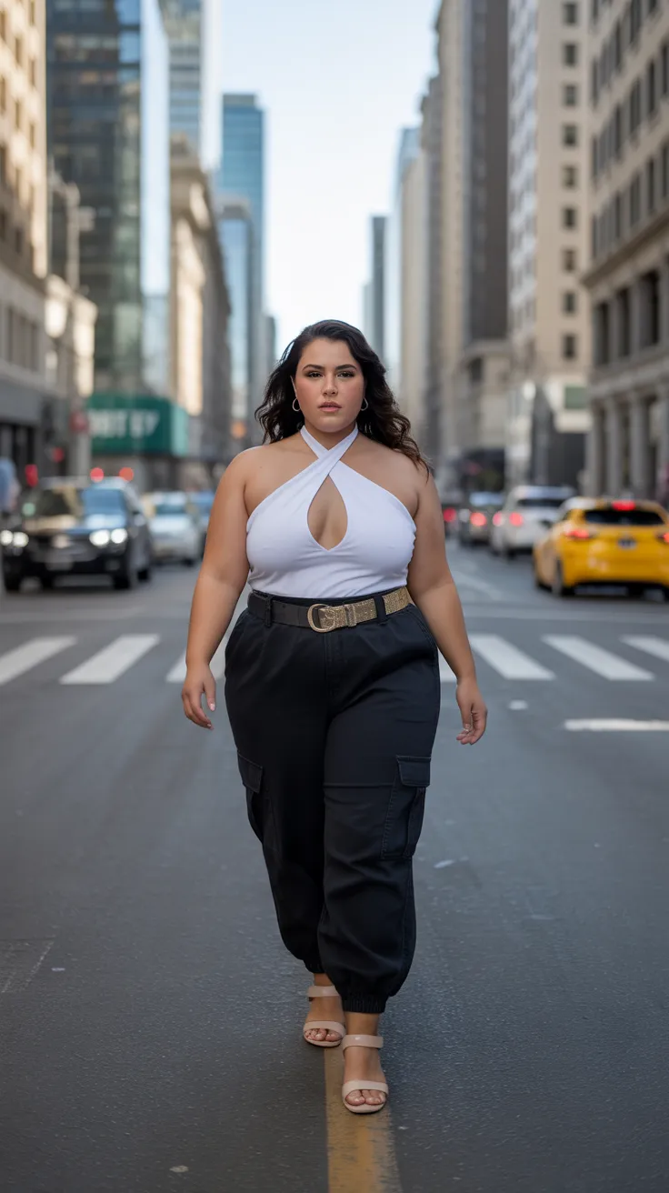 This outfit is a fun mix of comfort and style. The halter top pairs perfectly with cargo joggers, making it a great choice for casual outings or even cute plus size office outfits. Add a statement belt to cinch the waist, and you’ve got a look that celebrates every curve!