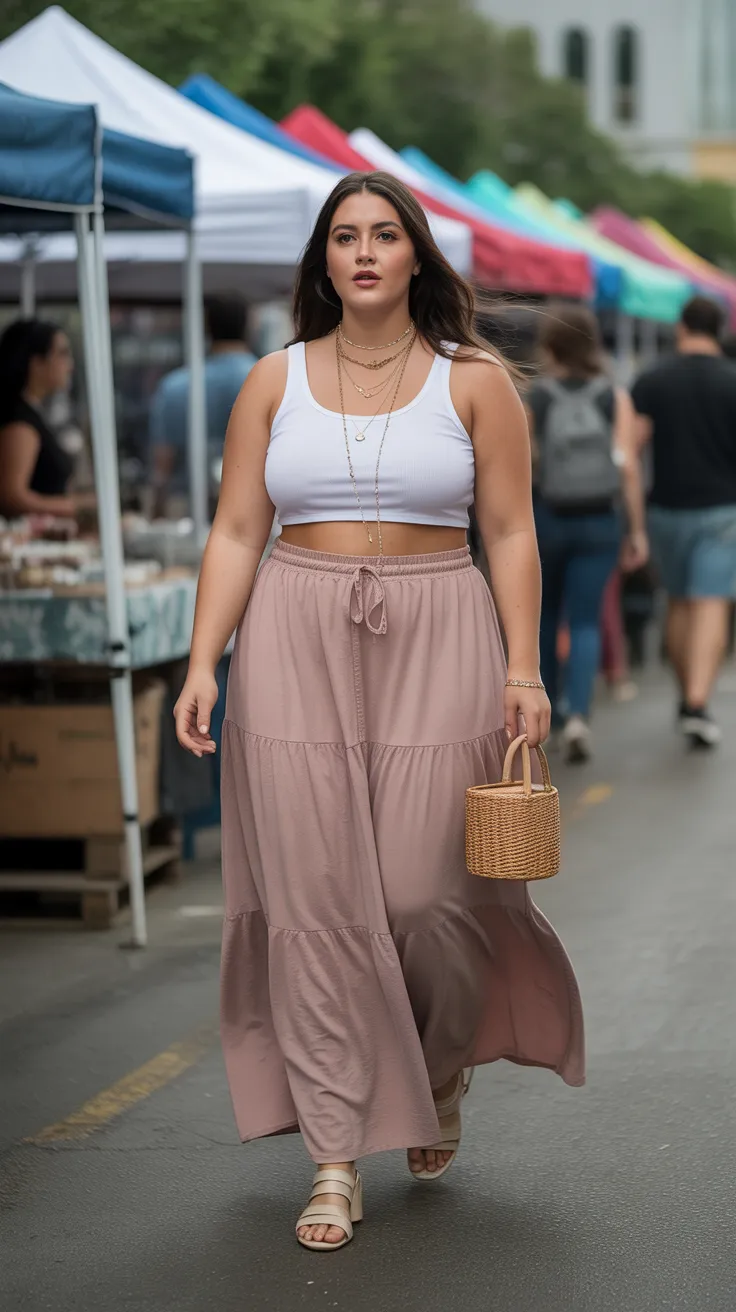 This outfit is a perfect blend of comfort and style. The crop top paired with a flowing maxi skirt highlights your curves beautifully while keeping things casual. Layered necklaces add a trendy touch that makes this look stand out in the world of plus size outfits.