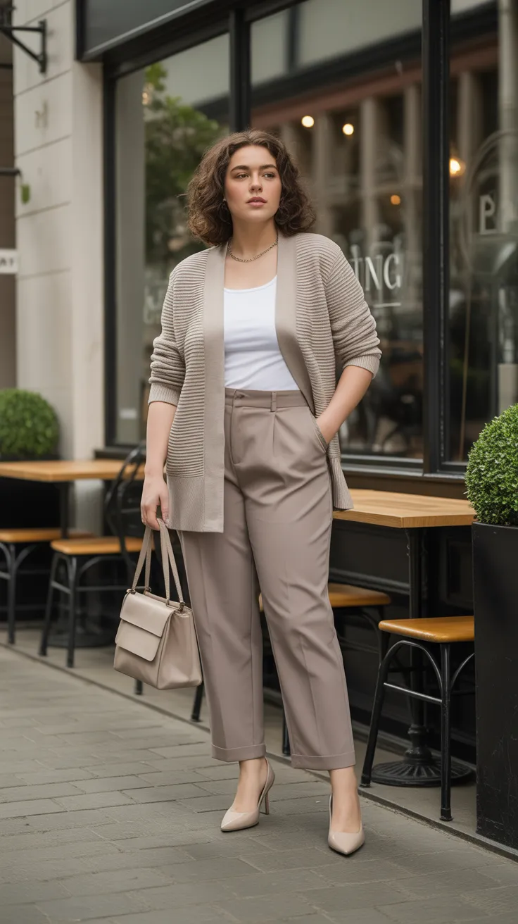 A structured cardigan paired with fitted slacks is a winning combo for any occasion. This look is perfect for the office or a casual outing, making it one of the cutest plus size office outfits around. With the right accessories, you can easily elevate this outfit to showcase your unique style and confidence.