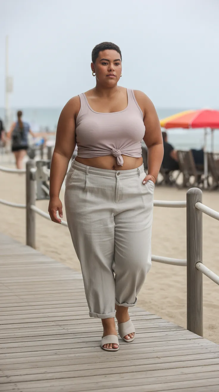 This outfit is perfect for those sunny days when you want to feel comfy yet stylish. A tucked tank paired with linen trousers creates a chic look that flatters every curve. Finish it off with some cute slides, and you’re ready for anything, from casual office vibes to a lunch date!