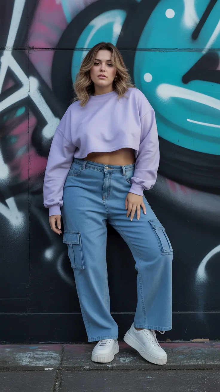 This look combines comfort and style effortlessly. A cropped sweatshirt pairs perfectly with plus size cargo jeans, creating a relaxed vibe that’s great for any casual outing. Finish off the outfit with some trendy platforms for a chic touch that’s perfect for big size fashion lovers.