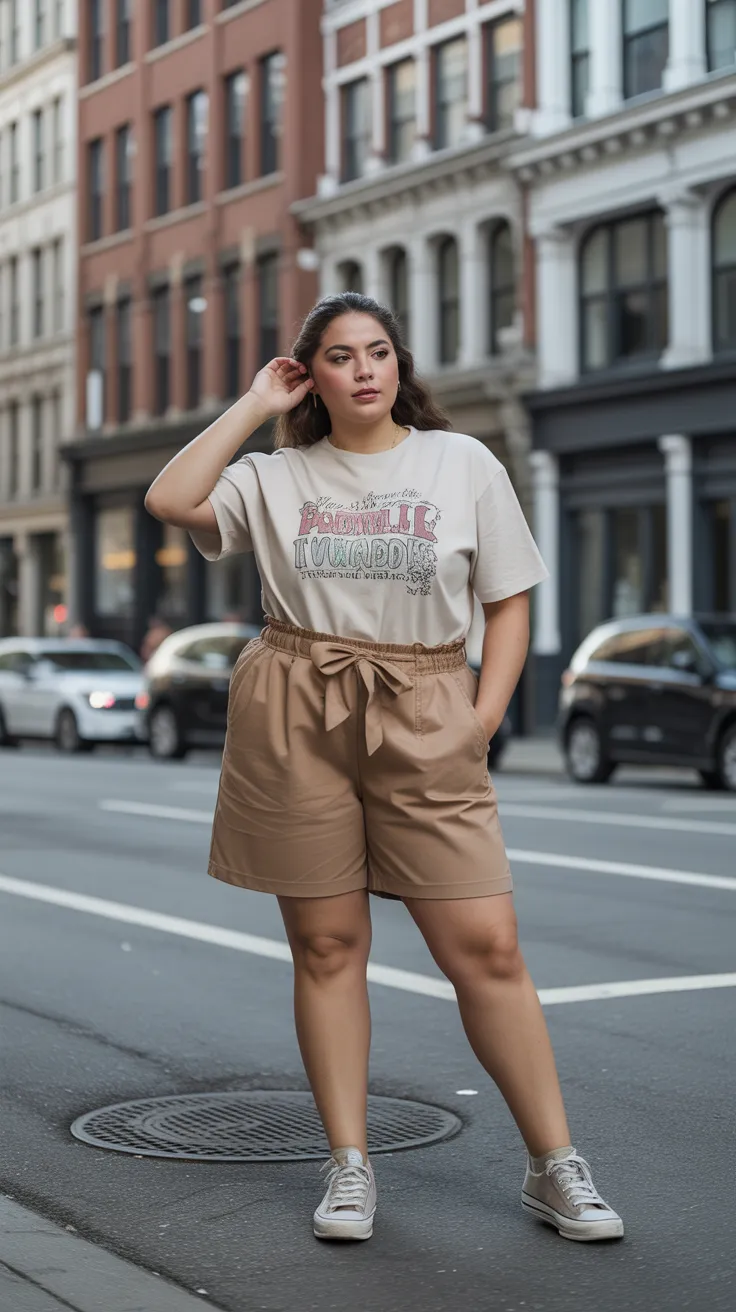 This outfit is perfect for those sunny days when you want to feel comfy and stylish. A graphic tee paired with paperbag waist shorts gives a fun, laid-back vibe that flatters every curve. It’s a great choice for casual outings or even cute plus size office outfits when styled right!
