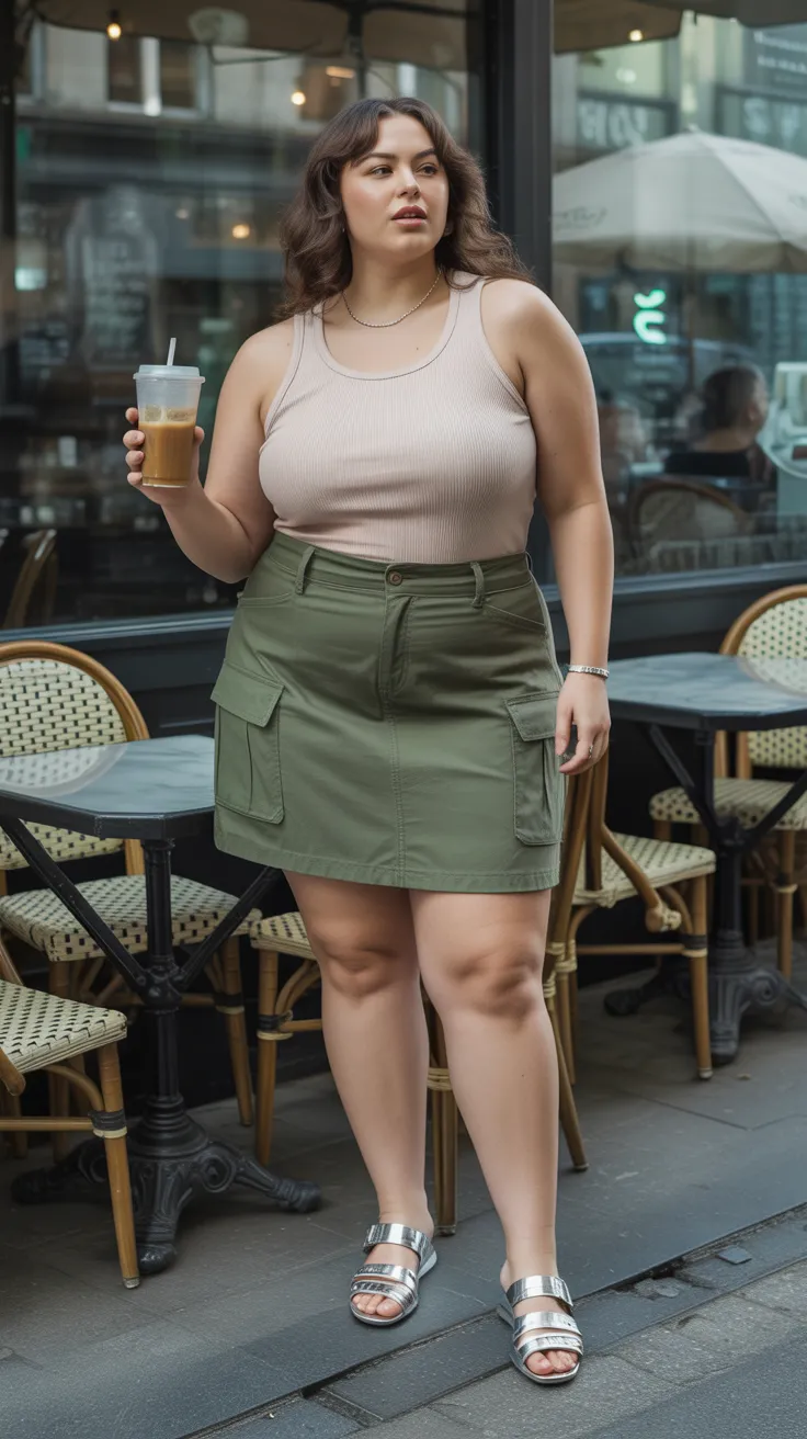 The cargo skirt paired with a ribbed tank top is a fun and stylish choice for any occasion. This look highlights your curves while keeping it casual and chic. Perfect for a day out or a cute plus size office outfit, it’s a must-have in your wardrobe!