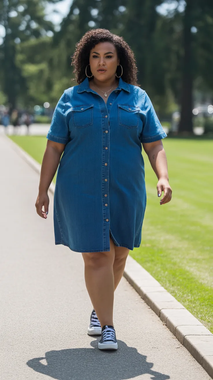 A denim dress paired with sneakers and hoop earrings is a fun and stylish choice for any occasion. This look is perfect for showing off your curves while keeping it casual and chic. Whether you’re heading to brunch or running errands, this outfit is a go-to for cute plus size outfits that make a statement.