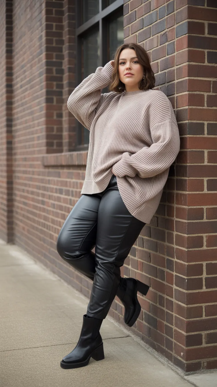 Faux leather pants paired with an oversized knit sweater create a chic and comfy look. This outfit is perfect for any occasion, blending style with ease. Whether you’re heading to the office or out with friends, this combo is a go-to in big size fashion.