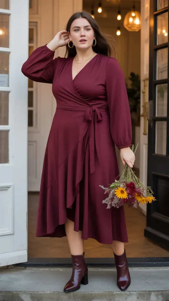 Wrap dresses are a classic for a reason they flatter every curve. A deep burgundy wrap midi paired with block-heel boots and gold hoops makes a gorgeous curvy outfit for Thanksgiving. The wrap style highlights your waist while giving enough room to feel comfortable through dinner. Plus, the rich autumn tone ties perfectly into holiday vibes. Ever notice how a wrap dress always feels chic without trying too hard? This one is polished, flattering, and seriously comfy.