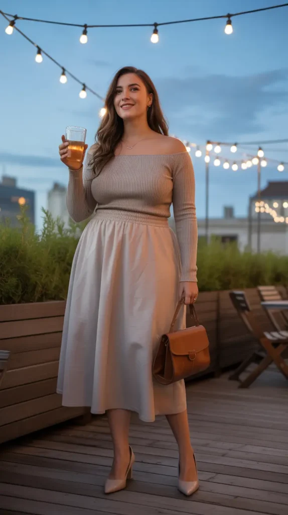 An off-shoulder knit top adds just the right hint of femininity. Pair it with a flowy midi skirt and heels, and youβve got one of those curvy fall outfits thatβs perfect for holiday gatherings. Itβs comfy, romantic, and totally stylish. The balance of cozy knit with a floaty skirt feels modern but effortless. Honestly, off-shoulder styles are underrated when it comes to plus size fall outfit ideas they flatter beautifully.