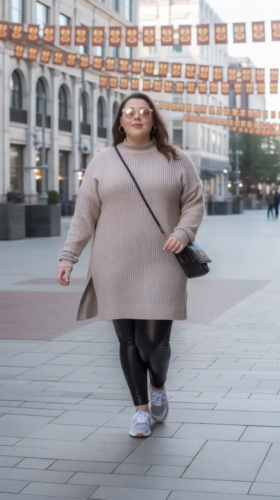 Tunic sweaters are long, comfy, and so flattering. Pair one with faux leather leggings and sneakers, and youβve got a curvy fall outfit that balances edge and comfort. The sweater keeps things cozy, while the leggings add texture. Perfect for running errands or attending casual gatherings. Honestly, this is one of those plus size fall outfit ideas that feels both trendy and effortless.
