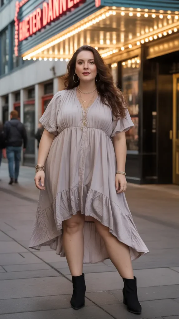 Asymmetrical hems add drama without effort. A flowy dress paired with boots and layered jewelry creates a plus size Thanksgiving outfit idea that feels chic and festive. The shape flatters curves while still being easy to wear. Perfect for evenings out or family dinners. Doesnβt an unexpected hemline always steal the show? This one does it beautifully.