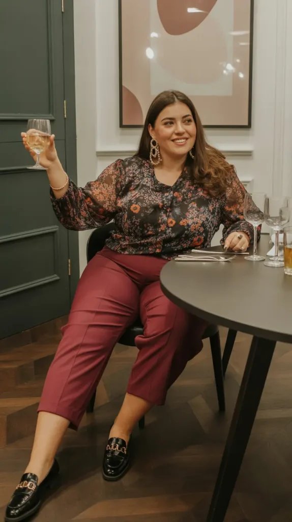 A printed blouse tucked into cropped trousers is polished but relaxed. Add loafers and statement earrings, and youβve got one of those curvy fall outfits that works for gatherings big or small. Prints bring personality, while trousers keep it sharp. Itβs a great balance of casual and stylish. Isnβt it nice when an outfit feels ready for both the office and the holiday table?