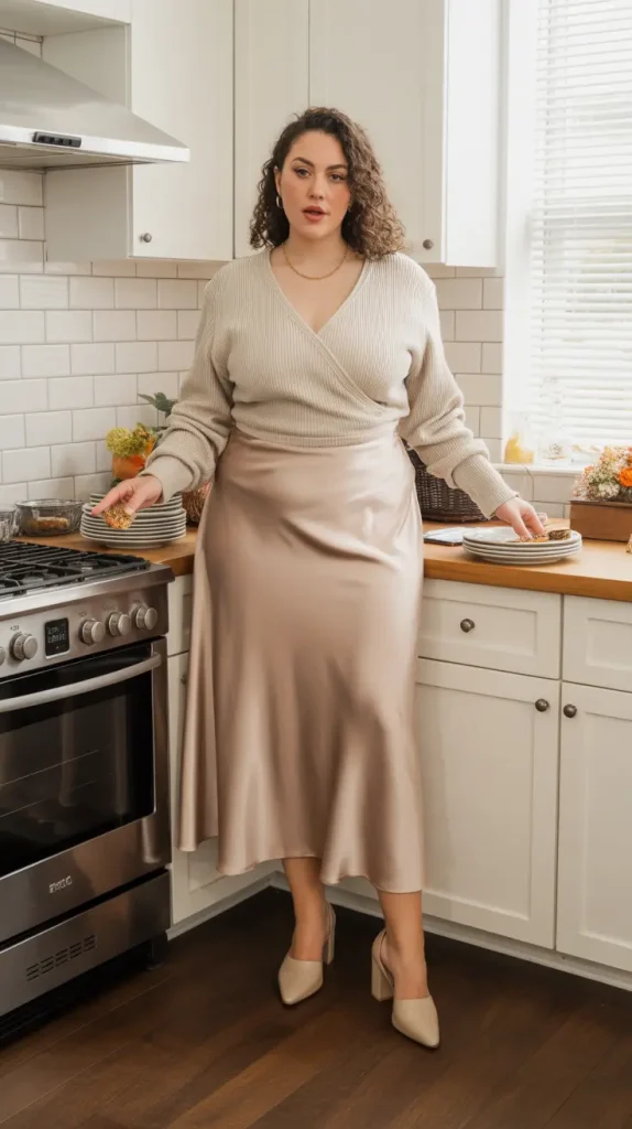 Satin skirts bring shine, and paired with a wrap cardigan they feel luxe but wearable. Add block heels, and youβve got a curvy outfit that looks perfect for a Thanksgiving dinner. The cardigan keeps it soft and cozy while the satin adds elegance. Doesnβt satin always feel like the holiday fabric we forget to wear more often?