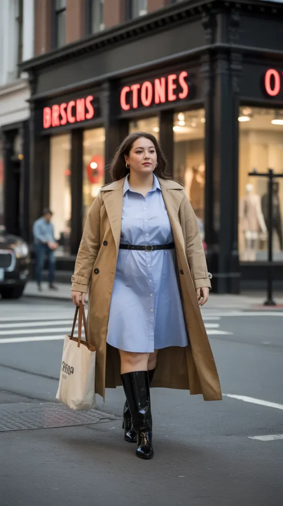 A belted shirt dress layered with a trench coat is polished but comfortable. Add boots and a tote, and youβve nailed a plus size Thanksgiving outfit idea that works for city strolls or dinner parties. The belt defines your shape while the trench adds drama. This is one of those curvy fall outfits that looks high-effort but feels easy. Isnβt that the dream during the holidays?
