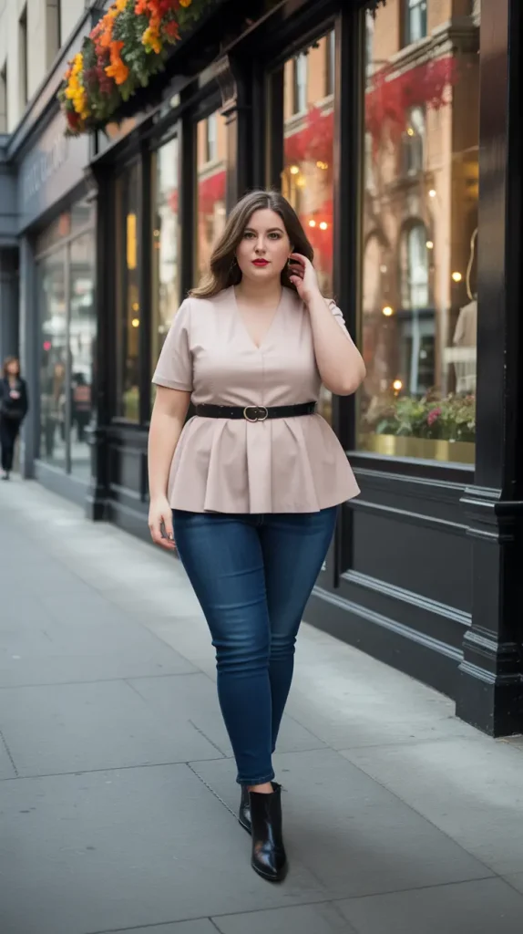 Peplum tops are magic for creating shape. Pair one with dark-wash skinny jeans, ankle boots, and a belt, and youβve got one of those plus size fall outfit ideas that looks chic but relaxed. The peplum adds movement and balances your silhouette beautifully. Perfect for city strolls or snapping photos in front of glowing shop windows. IMO, peplum is one of the most underrated wardrobe heroes for curvy fall outfits. Doesnβt it instantly make jeans feel fancier?