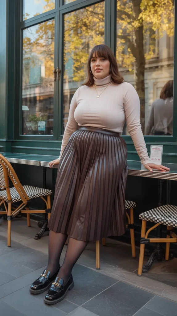 A pleated skirt paired with a fitted turtleneck is both elegant and comfy. Add tights and loafers, and youβve got a plus size Thanksgiving outfit idea thatβs cozy yet polished. The pleats create flow, while the turtleneck keeps it sleek. Itβs the perfect outfit for sipping coffee at a cafΓ© window or sitting around the holiday table. Pleated skirts are basically built-in movement makers they always catch the light and look chic. Doesnβt it feel like the easiest way to dress up without effort?
