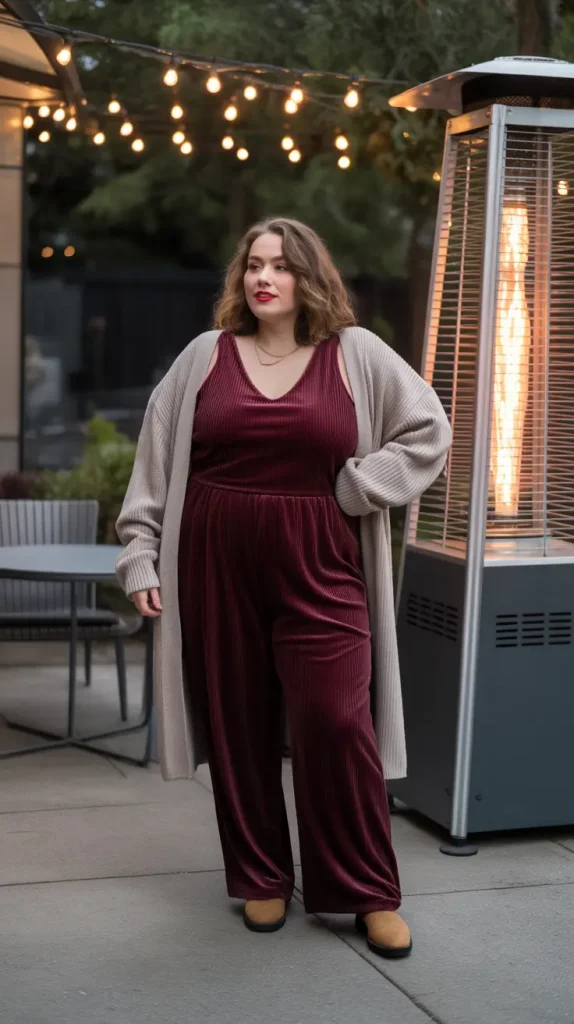 Velvet screams festive, and when styled as a jumpsuit itβs as comfy as it gets. Add a long cardigan and suede booties, and suddenly youβve got one of the most glamorous curvy fall outfits that still feels cozy. Perfect for outdoor dinners, patio parties, or just keeping warm while staying stylish. Velvet also has that natural shine that photographs beautifully. Ever notice how a jumpsuit feels like a power move but still lets you relax? Thatβs exactly the vibe here.