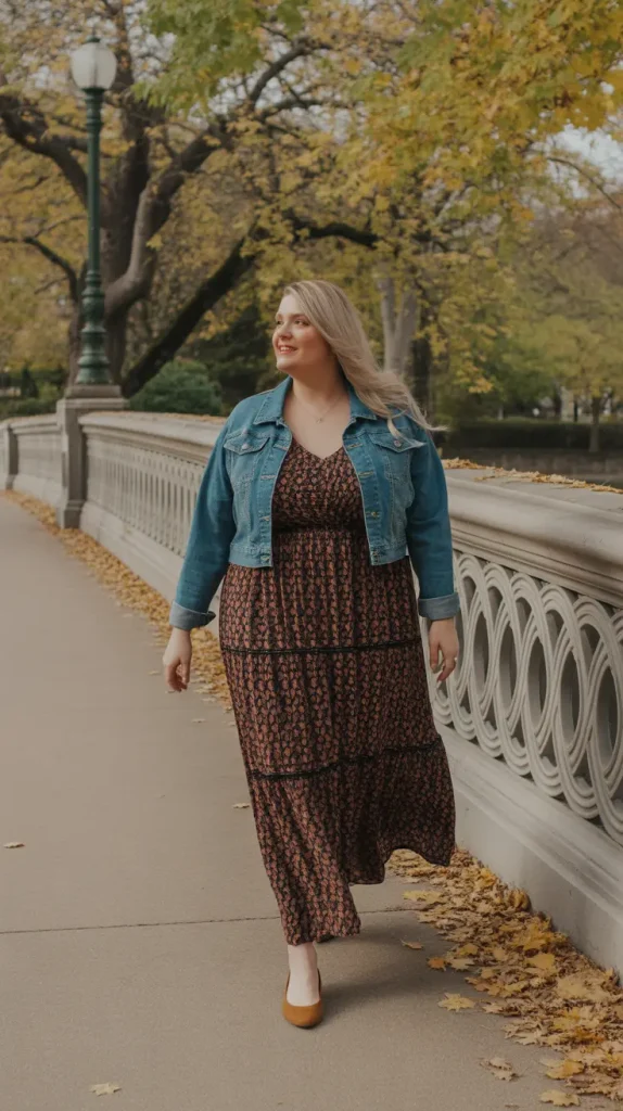 Empire waists highlight your shape while giving comfort room, which makes them ideal for Thanksgiving. Add a cropped denim jacket and flats, and youβve got a sweet and seasonal curvy outfit. This one is great for outdoor strolls or posing on a park bridge covered in autumn leaves. The denim keeps it casual, while the maxi dress adds that effortless flow. Isnβt it the best when style and comfort actually team up?