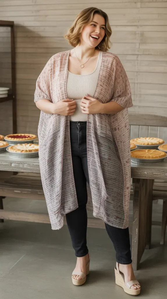 Kimonos are a dream for layering. Pair a printed wrap style with fitted black jeans and a tank top, and youβve got a playful but chic curvy outfit. Add wedge heels, and youβre ready to laugh and mingle around the holiday table. Kimonos add drama without weight, making them perfect for plus size styling. Ever notice how they instantly make jeans feel styled-up? Thatβs the win here.