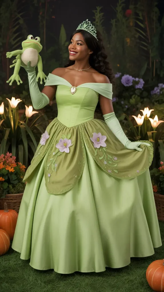 Tianaβs bayou gown is lush, glamorous, and totally magical. π A green ball gown with floral appliquΓ©s, satin gloves, and a tiara make this one of the most elegant Disney princess costumes. Carry a plush frog as a playful prop to complete the look. With a Halloween garden backdrop glowing with lilies, youβll look enchanting. This is a wonderful choice for anyone who wants to channel elegance with a touch of whimsy.