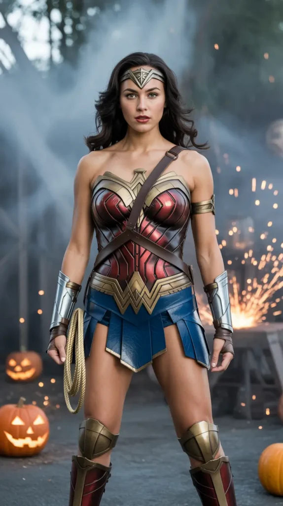 Not all princesses wear gowns some wear armor. βοΈ Wonder Womanβs warrior look brings strength and confidence to the party. With her red-and-gold armor, tiara, lasso of truth, and boots, youβre embodying a warrior princess vibe. This creative princess costume idea is perfect if you want something bold and empowering. Add a battleground backdrop with sparks and glowing pumpkins, and youβll look unstoppable.