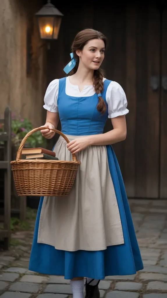 If you want something simpler but still charming, Belleβs blue pinafore dress from the village scenes is perfect. Itβs more casual, playful, and super easy to wear while still keeping that fairytale vibe. π Pair it with a white blouse, apron, and basket of books, and youβll look instantly recognizable. This is one of those Belle costume ideas thatβs perfect if youβre going for comfort but still want to stand out. Add a little Halloween twist with lantern props or cobblestone-inspired backdrops. Itβs sweet, stylish, and a nod to Belleβs bookish personality.