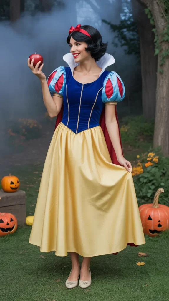 Sweet, classic, and instantly recognizable, Snow White is always a win. π A blue bodice, puffed red-striped sleeves, and flowing yellow skirt create the perfect fairytale look. The red bow headband ties it all together and adds her signature charm. Carry a shiny apple for a playful prop that nods to her story. This is one of those princess costume ideas thatβs simple but full of impact. Add a spooky forest backdrop with pumpkins, and suddenly youβve got Halloween magic built in.